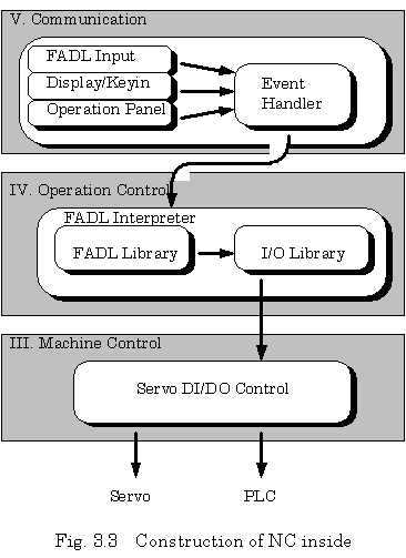 Control system of the NC device should convert the generated operation instruction into the actual control command matched to the actuator and the I/O equipment interpreting the processing data. Therefore, the composition becomes a combination of the interpretation part of the operation instruction and the control sub-set matched to the control equipment connected with. It is necessary to transfer the various data and signals between these three main modules. Providing for the exchange of necessary information between each modules will have the tight relation between each modules and the system with high modulality is not guaranteed as a result. To cancel such problems, Event Handler Module by which the transfer of information in NC was controlled was prepared.