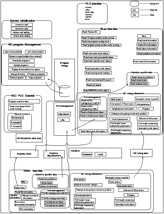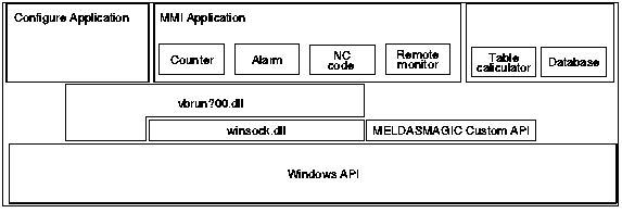 In the MAGIC Station, three kind of processes are running: (1) MMI application processes, (2) Configuration Applications (3) Data Arranging Application Processes. MMI application calls library stacks to communicate with MELDASMAGIC card( shown in Figure 5.3.2). These are shown in Figure 5.3.3 which is a kind of MMS (Manufacturing Message Specifications).