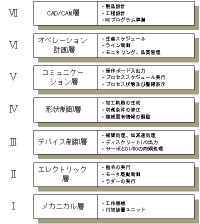 そこでOSEC-Iでは図 1-4に示す参照モデルを規定することで真の『オープン』コントローラのためのアーキテクチャ策定を目指した。このOSEC-Iアーキテクチャでは、コントローラは生産システムの一部として定義され、ここでは設計データから加工までの情報の処理手順が明確にされている。具体的には、今までブラックボックスだったCNCを含めた生産システムを、処理階層として入力処理を主に行う階層・演算を行い軌跡を創成する階層・制御を主とする階層など7階層に分類し、各階層で処理すべき内容を定義した。