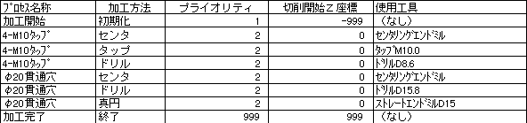 hole20.milling(endmill15); // タッピング m10_4.tapping(); } } |