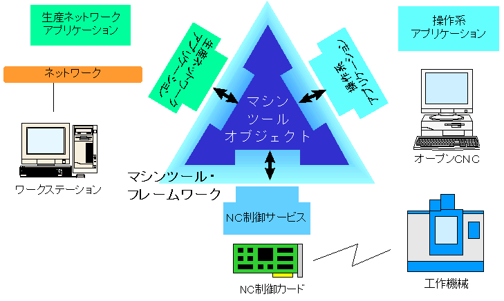 そこでは、ソフトウェア開発手法のフレームワークの考えを取り入れ、NC工作機械を軸、スピンドルなどの構成要素に分けて標準モデル化し、このモデルに基づいたソフトウェア部品とその間のインターフェースを定義しています。