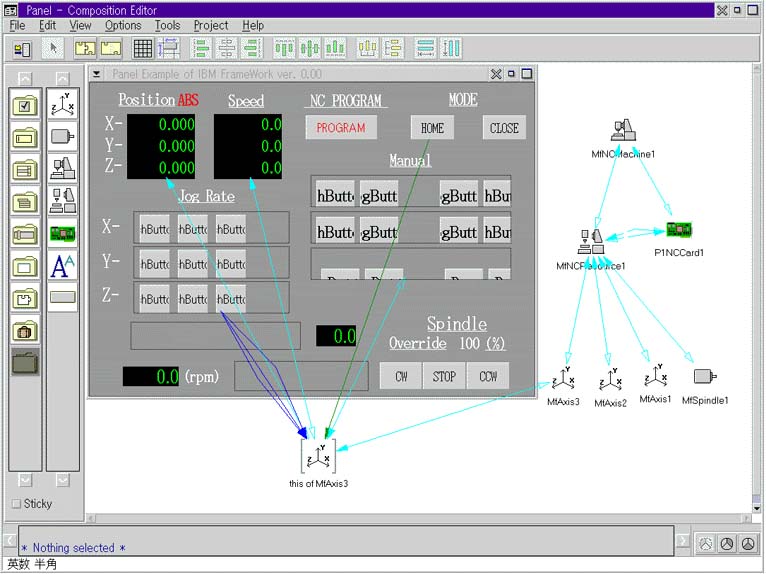 日本アイ・ビー・エムでは、OSEC準拠の工作機械モデルに基づいた操作系ソフトウェアの開発環境として、工作機械のソフトウェア部品とヒューマン・マシン・インターフェースを構築するためのGUI(グラフィカル・ユーザ・インターフェース)パーツ群を、IBM VisualAge for C++上のソフトウェア部品ライブラリーの形で製品化しました。