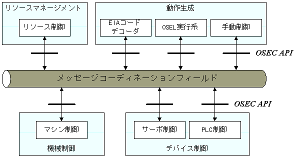 論理的な機能ブロックから構成されるOSECアーキテクチャは一意に規定されるものである。しかしこれらの各機能ブロックを物理的に実装するときには、デバイスドライバ・プロセス・プロセス間通信といったシステムの機能、静的なライブラリ・DLLといった組込の手法、利用する制御カードなどのハードウェア要因、あるいは各種ソフトウェアの実行制御・監視用に追加されるソフトウェアモジュールなどの実装方式に依存したものとなる。そのためアーキテクチャを実装するための実装モデルとしては1つには限定されず、システムの規模や構成するハードウェアなど実装の形態あるいは使われ方に応じて複数存在することになる。図 3-3は特に各機能ブロック間の結合関係を明示的にした実装モデルである。