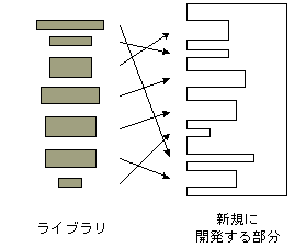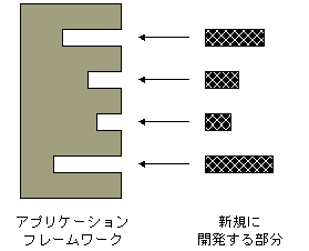 操作系ソフトウェアに関するOSECアーキテクチャでは、こうした要求事項を満たすための手段としてアプリケーションフレームワークというソフトウェア開発手法を全面的に取り入れた。従来のソフトウェア開発手法では、ソフトウェアの大部分は一つ一つ積み重ねていくようにして開発する。そこでの開発労力は、あらかじめ用意されたソフトウェアライブラリを呼び出すことで低減できるが、あらかじめ用意された部分に比べて新規に開発する部分の比率はかなり多い(図 3-5(a))。一方、アプリケーションフレームワーク手法では、ソフトウェアは今までのような積み重ねによっては開発しない。あらかじめアプリケーションソフトウェアのひな型が用意されていて、目的に合わせてそのひな型を変更したり拡張するのが開発作業の主となる(図 3-5(b))。当然こうした改良にはあらかじめ提供されるライブラリが利用できる。このようにアプリケーションソフトウェアのひな型、すなわちアプリケーションフレームワークを利用することで機械に対する操作系ソフトウェアの開発を効率よく行えるよう目指したのである。