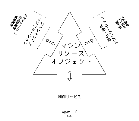 図 3-7は工作機械を対象としたマシンリソースオブジェクトにおける機械資源のクラスの概略図である。軸・スピンドル・ツール・PLCなど工作機械の持つ様々な資源を論理的に分析し、各資源の属性・機能を明示的に定義してオブジェクト指向関連図(ORD)としてまとめたものである。これらの資源に対する指令と状況の問い合わせが各資源オブジェクトに対するメソッドの形で定義されている。操作系ソフトウェアとしては、機械の各資源オブジェクトにメッセージを投げる形で機械に指令を与えたり機械の状況を知ったりする。