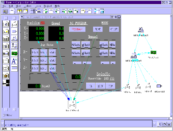 最近のソフトウェア開発環境やツールの動向として、アプリケーションフレームワークを備え、ソフトウェアを部品化することで効率的に開発が行えるものが注目を集めている。こうした統合環境のもとで、マシンリソースオブジェクトを中心とする、工作機械の操作系ソフトウェアのためのアプリケーションフレームワーク(マシンフレームワーク)によって操作盤画面を作成した例を紹介する(図 3-8)。この例で使用したマシンフレームワークは、ビジュアルビルダや高機能コンパイラなどを備え効率良くC++アプリケーションソフトウェアを開発するための統合環境であるVisualAge C++を基盤としていて、次のような特徴を持つ。